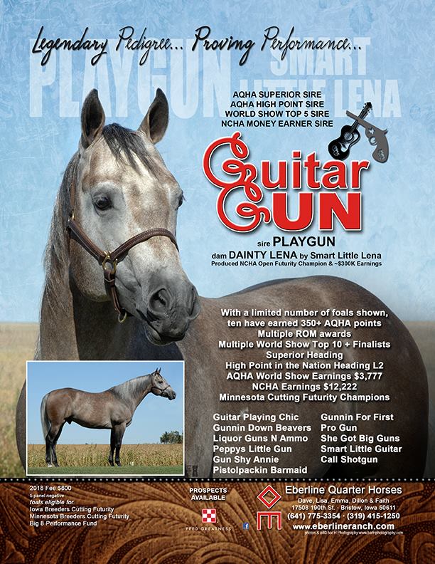 Sire: Guitar Gun is an AQHA Superior sire, AQHA high point sire, AQHA World Show top 5 sire and a NCHA money earning sire. While he was unshown, due to injury, his offspring have earned over 400 AQHA points, 8 AQHA performance ROMs plus many have AQHA World Show and NCHA earnings. He is often referred to as a top choice for an all-around ranch horse type stallion. Guitar Gun is by the legendary Playgun, LTE of $183,538 and PE of $10+ million.