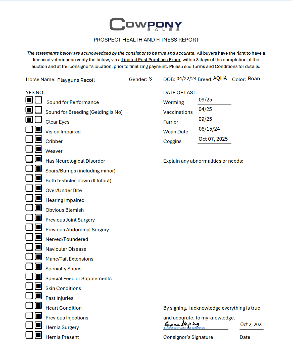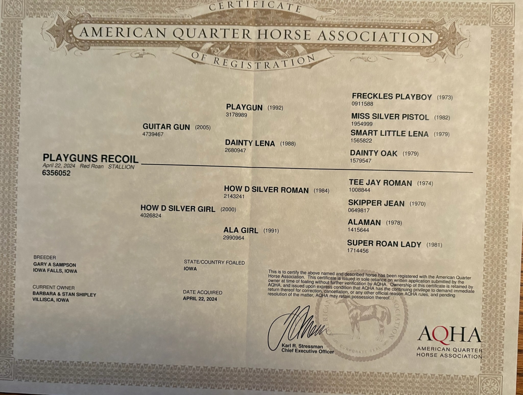 Pedigree included on his papers: Playgun, Smart Little Lena, Freckles Playboy